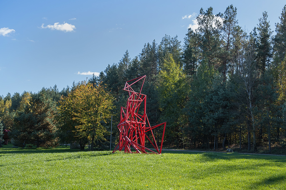 The sculpture adds a human dimension to the natural landscape, enriching it with constructivist geometric elements.