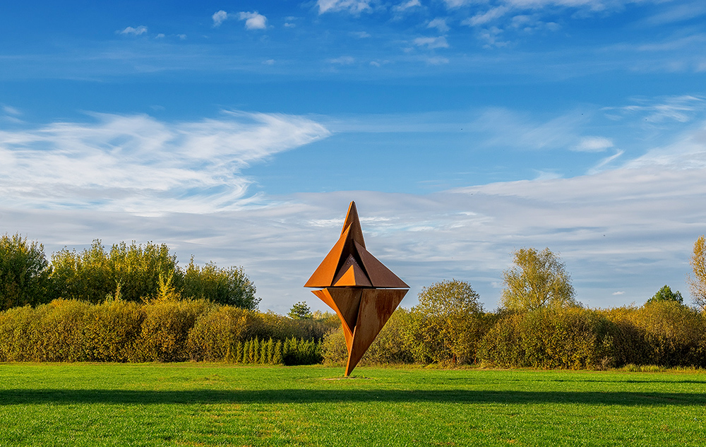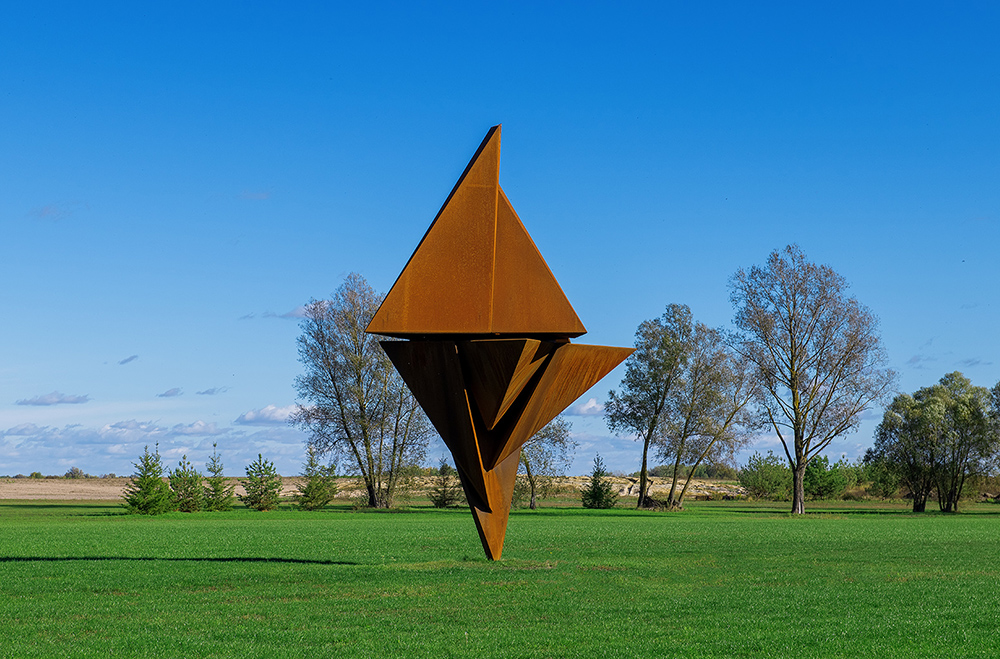 Масивний об’єм, вигини якого ніби сформовані стрімкими вітрами, тримається на єдиній точці опори, втілюючи хиткість існуючого стану речей. Динамічна взаємодія, ритміка гострих трикутних форм, зібраних в один масивний металевий «пучок» – концентрат напруги і відповідальності історичного моменту.
